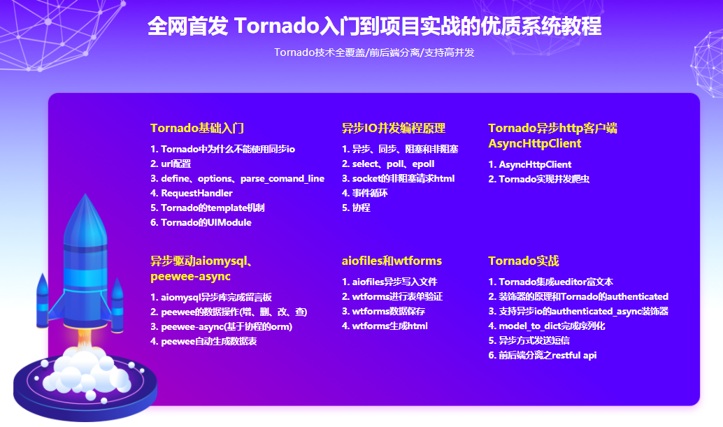- 视频:1-1 Tornado从入门到进阶 打造支持高并发的技术论坛-导语 (13:23)试看