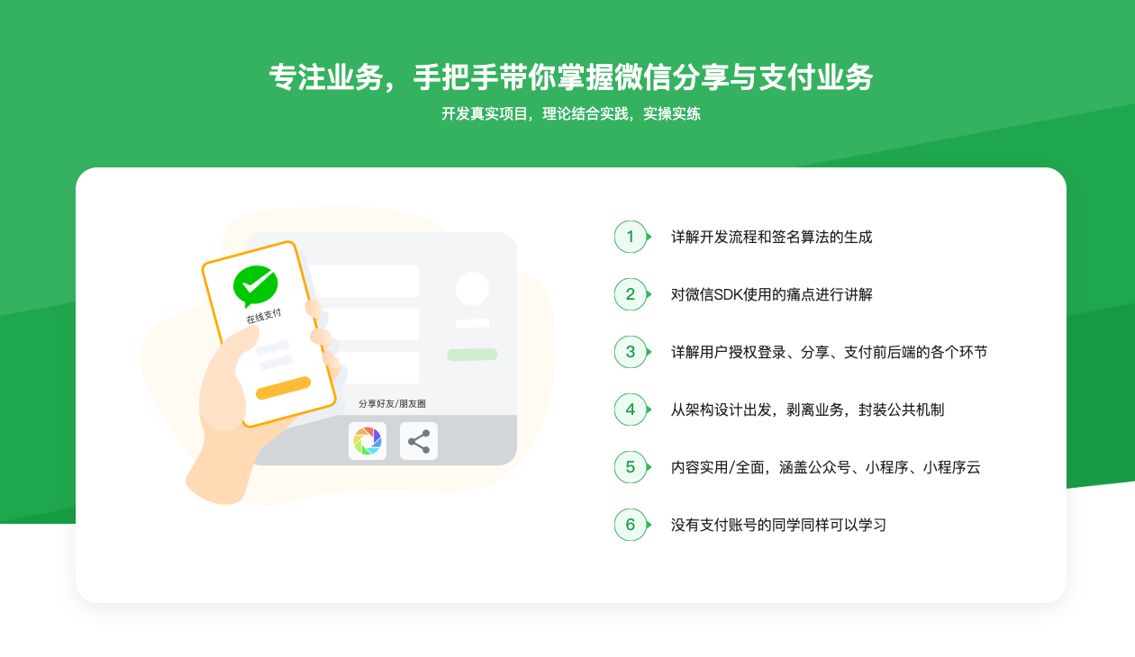 • 本章节主要以Node开发为主,给大家讲解如何生成预支付ID,如何签名,如何生成小程序端的package信息,通过本节课的学习能够掌握小程序从分享授权到支付的完整流程。