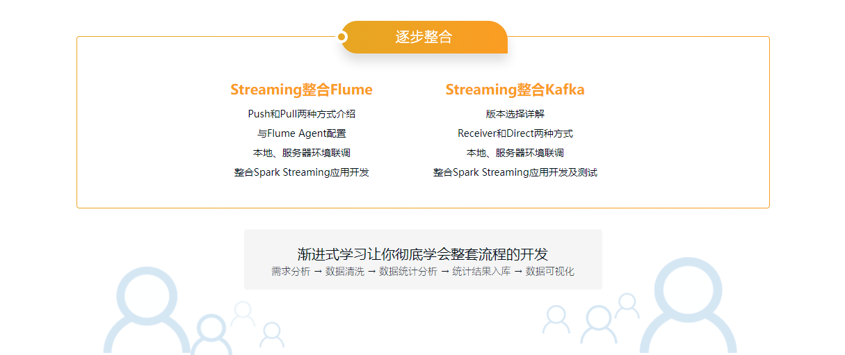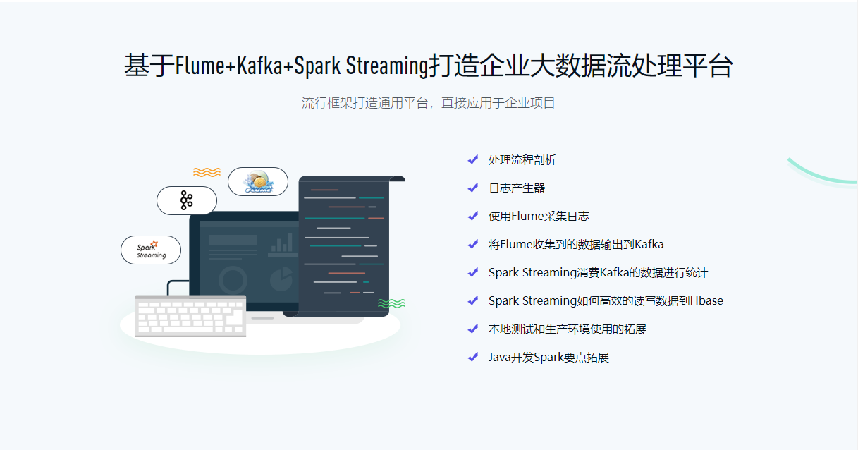 本课程从实时数据产生和流向的各个环节出发,通过集成主流的分布式日志收集框架Flume、分布式消息队列Kafka、分布式列式数据库HBase、及当前非常火爆的Spark Streaming打造实时流处理项目实战,让你掌握实时处理的整套处理流程,达到大数据中级研发工程师的水平!