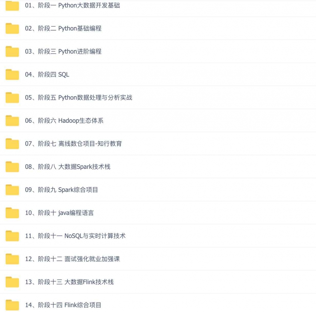 • 学完收获:熟练使用DS、Oozie、AirFlow等任务调度工具,完成大数据任务调度熟悉Linux基本操作,完成分布式虚拟机搭建任务了解数据仓库开发从需求沟通、标签定义、编码开发、整个流程能够掌握Python语言基础,利用Python语言完成常见编程任务能够掌握Pandas数据处理和数据分析的工作能够掌握Java语言基础,利用Java完成MapReduce编程,Flink任务编程熟练掌握Hadoop生态体系,掌握MapReduce原理及优化技巧熟悉掌握Spark生态技术栈,利用SparkCore基础数据处理能够使用SparkSQL完成大数据数据处理及统计分析能够掌握Hive基础内容,利用HiveSQL完成基础数据仓库构建能够利用Spark On Hive完成企业级离线数据处理及统计工作熟练Mysql数据库,有使用一种ETL方式经验优先完成Spark/Hadoop/HBase/Kafka/Flink等组件的搭建能够基于Flink进行实时分析和离线分析掌握Flink核心4大特性能够基于FlinkSQL完成常见大数据统计分析任务能够使用Hbase完成大数据异构数据存储能够掌握Kafka消息队列基础使用能够掌握Kafka和Flume对接完成实时数据采集工作熟练使用FineBi等BI工具完成数据展示任务