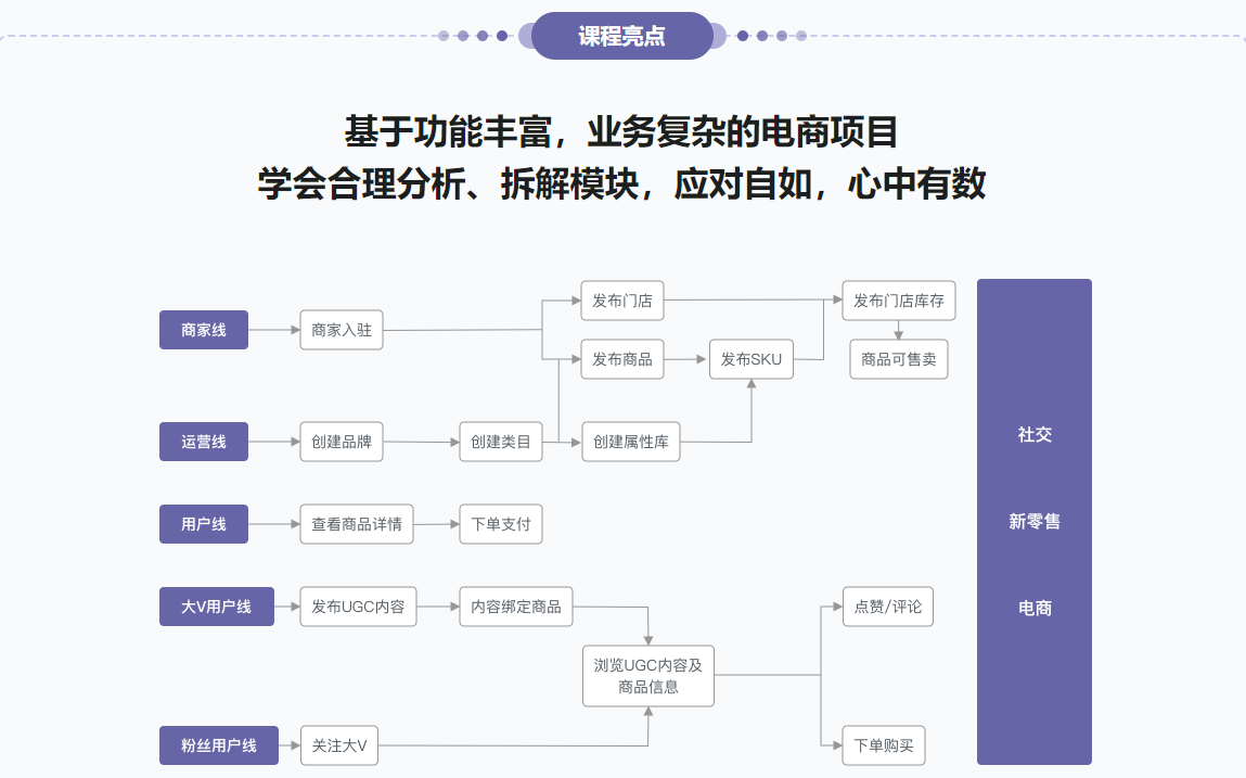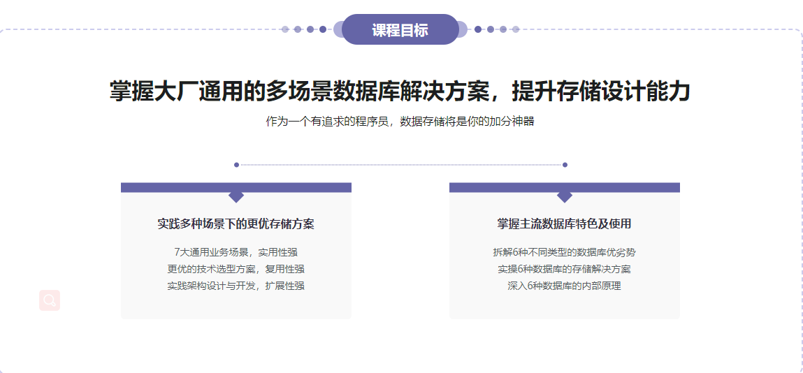 - 优秀的后端开发工程师,对于数据库存储方面,光会常规的CRUD已然不够,更需要懂各种数据库产品的优劣及适用场景,并能在适合的业务实践中准确选取合适的产品并应用。本课程利用一个社交新零售项目,带你学习如何基于不同的业务场景侧重的模式选择合适的数据库,并使用合适的设计形式,提升项目质量。