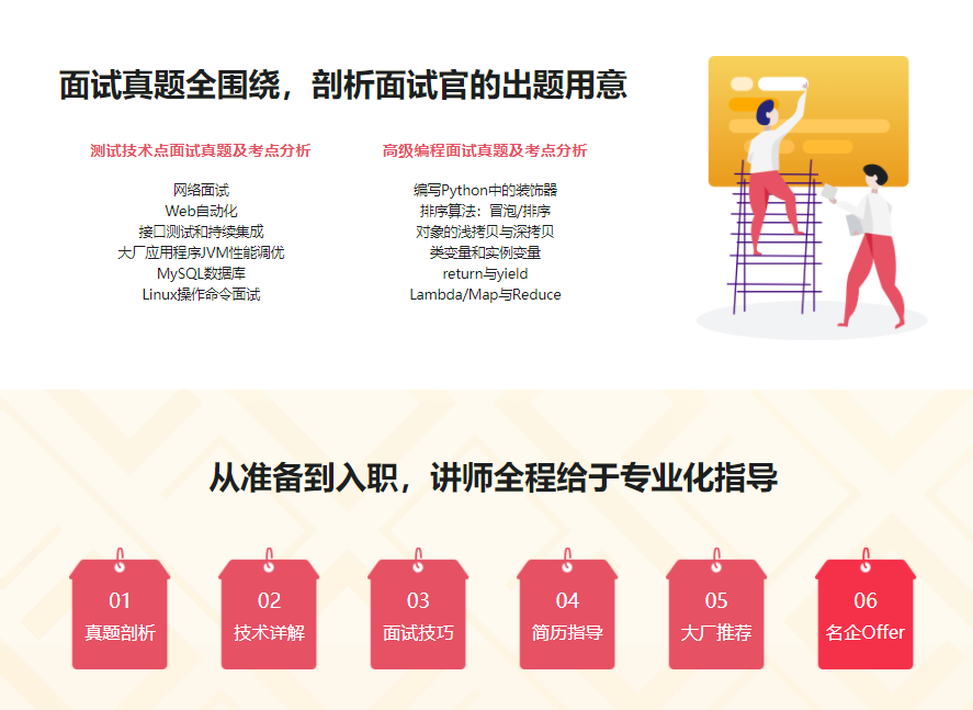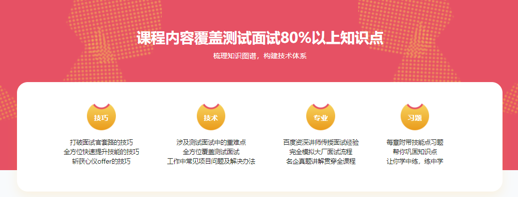 课程主要以面试流程为主线。从面试官的角度为大家讲解,面试中的重难点以及注意事项。全方位无死角的打造你的面试技巧,以及每一个技术细节。课程除了面试技术点外,更有面试指导,以及大厂内荐,让你不惧面试,稳拿offer。