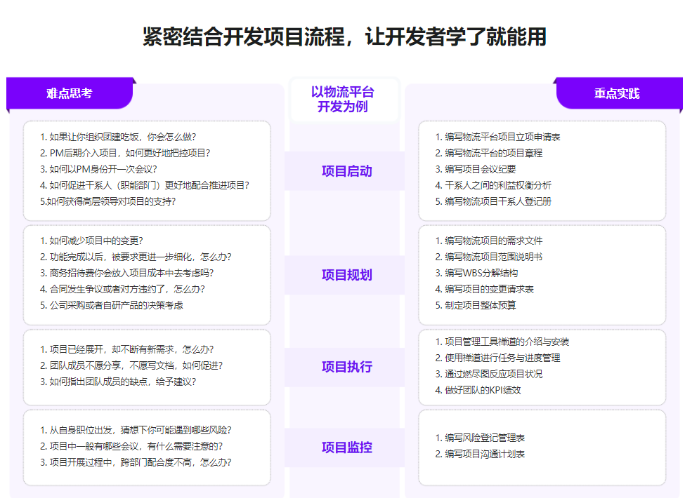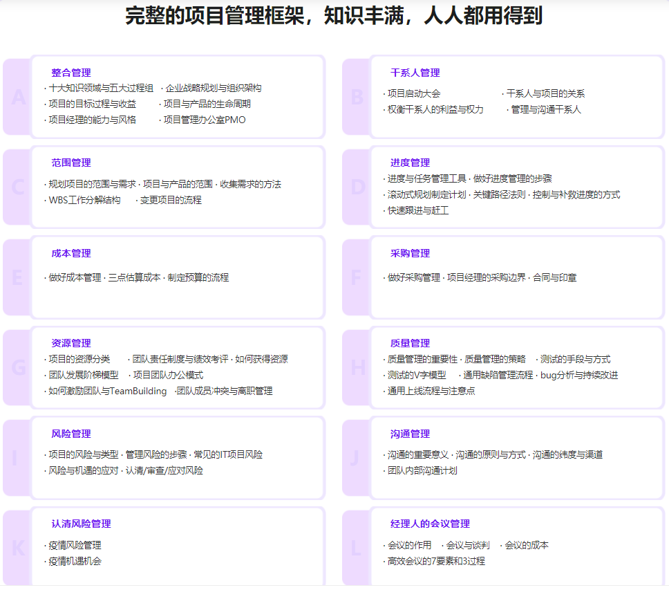 项目管理无处不在,它不仅仅是一个岗位,更是一套科学的工作方法,能够很好地指导我们的工作与生活。但很多开发者缺少项目管理意识与技巧,为自己的工作增添了许多额外的阻碍,不仅项目推进不及预期,也让个人职场发展受限。本课程带你系统性学习项目管理,让你不管做开发还是转PM,都能游刃有余!
